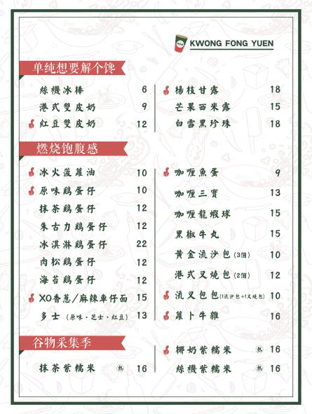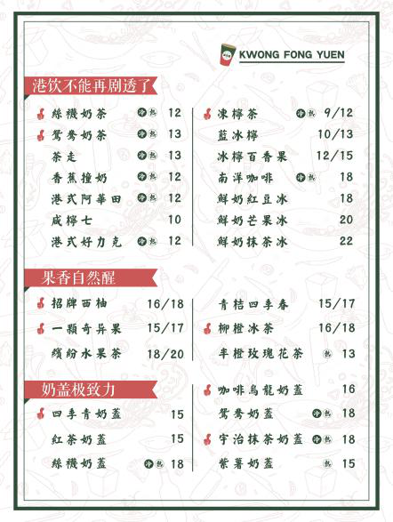 從廣芳園的菜牌來(lái)看,分類(lèi)就較為明確。作為茶飲+小食的品牌,在食和飲的方面做出了明確的區(qū)分。同時(shí),在飲品方面,又著重進(jìn)行了細(xì)分:以港飲、奶蓋、果香、谷物幾個(gè)分類(lèi),很容易讓顧客做出偏好選擇。