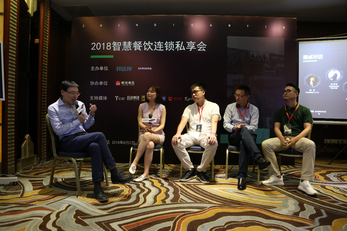 活動(dòng)最后的圓桌論壇環(huán)節(jié),在開(kāi)店邦創(chuàng)始人兼CEO郭景的主持下,蝦吃蝦涮品牌創(chuàng)始人牛艷、楊國(guó)福麻辣燙副總經(jīng)理徐明哲、望湘園副總裁趙建光、蝦吃蝦涮品牌創(chuàng)始人牛艷、慕瑪披薩合伙人顧葉挺共同就“連鎖餐飲基于技術(shù)升級(jí)的自我賦能”展開(kāi)了深入的探討。