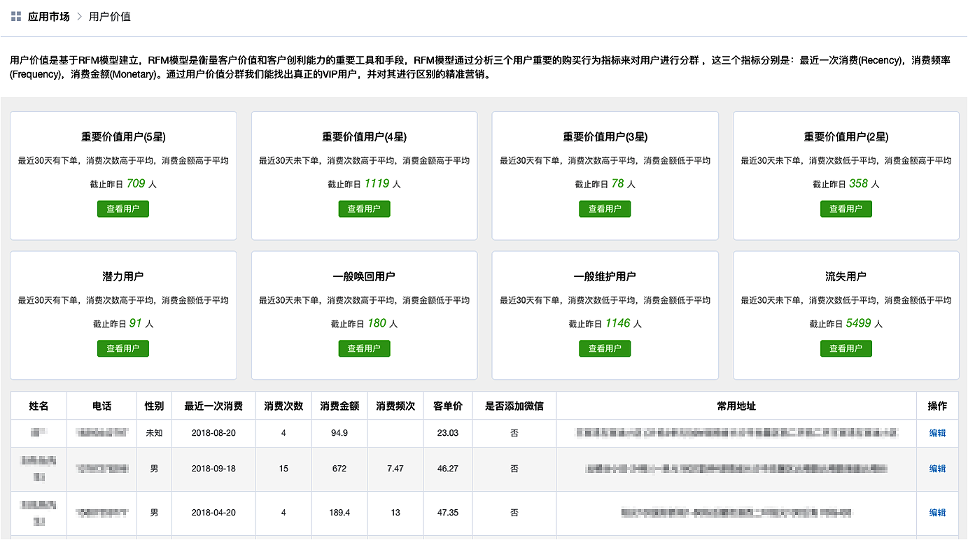 用戶價(jià)值是基于RFM模型建立,RFM模型是衡量客戶價(jià)值和客戶創(chuàng)利能力的重要工具和手段,RFM模型通過分析三個(gè)用戶重要的購(gòu)買行為指標(biāo)來對(duì)用戶進(jìn)行分群 ,這三個(gè)指標(biāo)分別是:最近一次消費(fèi)(Recency),消費(fèi)頻率(Frequency),消費(fèi)金額(Monetary)。通過用戶價(jià)值分群我們能找出真正的VIP用戶,并對(duì)其進(jìn)行區(qū)別的精準(zhǔn)營(yíng)銷。依據(jù)經(jīng)典的二八原則,我們80%的銷售由20%的用戶貢獻(xiàn),那么我們?nèi)绾慰焖俣珳?zhǔn)的找到那20%用戶并與其發(fā)生深度關(guān)聯(lián),是極度考驗(yàn)我們對(duì)數(shù)據(jù)的綜合分析處理能力的。同時(shí)我們也可以做一個(gè)實(shí)驗(yàn),去美團(tuán)后臺(tái)使用精準(zhǔn)營(yíng)銷,給高消費(fèi)熟客與需一般挽留的流失顧客發(fā)同樣的優(yōu)惠券,高消費(fèi)熟客的使用率會(huì)遠(yuǎn)遠(yuǎn)高于需一般挽留的流失顧客。