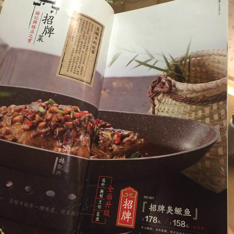 翻開(kāi)第一頁(yè)就是:在楊記興,我們?yōu)槟銣?zhǔn)備了好油,好食材,地道臭鱖魚(yú)。