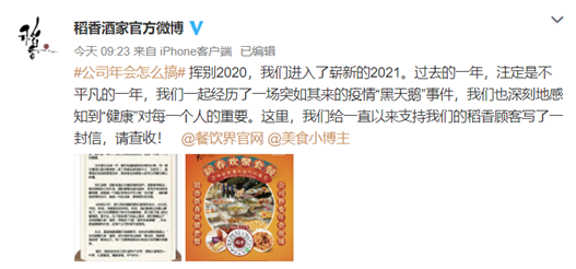 1月26日,稻香酒家在其官方微博特別發(fā)布了“一封致顧客的信”,意在以書信形式正式發(fā)布其“派對團餐外賣新品”。信中提到:“為了規(guī)避疫情之下不必要風險,迎合用戶的線上需求,我們特推出了‘派對團餐外賣’服務?!辈⒃跁胖姓嬲\邀請顧客搶先體驗“派對團餐外賣”。