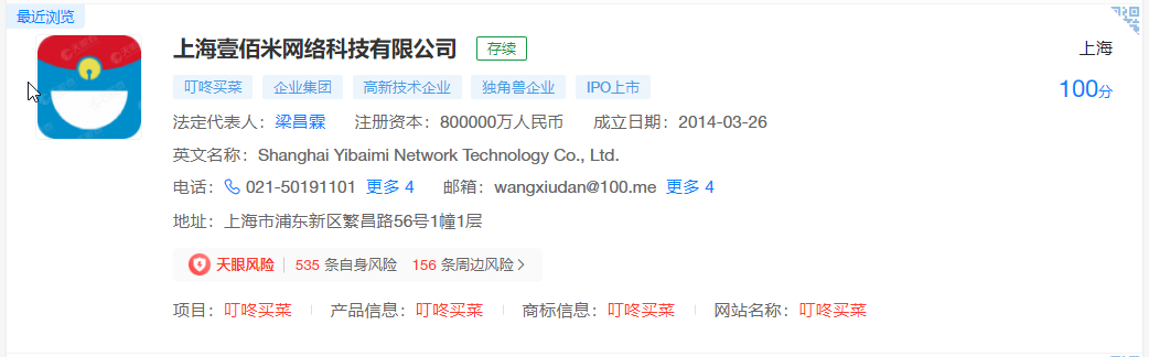 天眼查App顯示,“叮咚買菜”所有權(quán)屬于上海壹佰米網(wǎng)絡科技有限公司,該公司成立于2014年3月,注冊資本800000萬人民幣,由Dingdong Fresh (Hong Kong) Limited全資持股。(天眼查)
