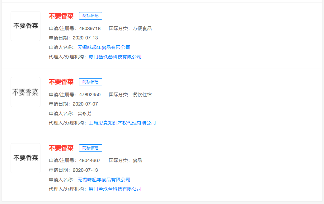 據(jù)悉,2月24日是“世界討厭香菜日”,天眼查商標信息顯示,“不要香菜”和“不吃香菜”商標曾被多方申請注冊商標,包括食品公司、餐飲管理公司、傳媒公司、化妝品公司及個人申請等,國際分類涉及食品、方便食品、餐飲住宿、服裝鞋帽。其中3枚“不要香菜”商標狀態(tài)均已顯示為無效,“不吃香菜”商標流程也已顯示為駁回復審。(天眼查、DONEWS)