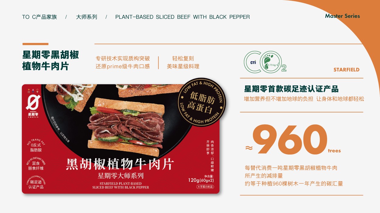 值得注意的是,目前「星期零」已進(jìn)入整肉塑性階段,可創(chuàng)造出具有整塊肉紋理的產(chǎn)品,通過(guò)間斷式針織風(fēng)味和精進(jìn)酶法交聯(lián)技術(shù),達(dá)到模擬肌纖維的效果,形成色、香、味與真肉媲美的植物肉,為國(guó)人提供健康和美味兩全的飲食體驗(yàn)。該技術(shù)的代表產(chǎn)品“黑胡椒植物牛肉片”不僅可以開(kāi)袋即食,還可通過(guò)輕烹搭配主食享用,滿(mǎn)足更多元的植物蛋白餐食需求。在不犧牲風(fēng)味口感的基礎(chǔ)上,產(chǎn)品通過(guò)添加植物性配料,解決了大部分傳統(tǒng)腌制肉類(lèi)產(chǎn)品添加“防腐劑”“亞硝酸鹽”的固有缺點(diǎn),并具有0反式脂肪酸、低脂高蛋白等優(yōu)勢(shì),憑借出色的體驗(yàn)獲得市場(chǎng)好評(píng)。同時(shí)這款產(chǎn)品,經(jīng)過(guò)華測(cè)碳足跡認(rèn)證,對(duì)比同類(lèi)動(dòng)物肉產(chǎn)品碳排放約減少84%。