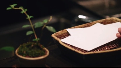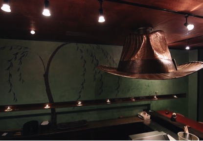 早乙女在17歲時決定把制作天婦羅當(dāng)做一生的事業(yè),他幻想室內(nèi)的裝飾要讓很多藝術(shù)家來做,自己也要像藝術(shù)家一樣去炸制天婦羅。而今天,是山居的店內(nèi)裝潢充滿了藝術(shù)感。進店掀開紗簾后,可以看到一條并不算長的走廊,光線不強烈,深色調(diào),墻上和柜子上有很多藝術(shù)品,有些是早乙女自己畫的墻畫,也有前田正博、山上亮、上田哲也等人的陶藝作品。從壁紙到壁燈再到起到掩映作用的綠植都好像是渾然一體。盛放剛出鍋食物的餐碟旁有一盆小小的綠色植物,并不茂盛,客人面前還有成套的進食餐具,同圍坐的吧臺一樣,這些東西都是古色古香的氣息。