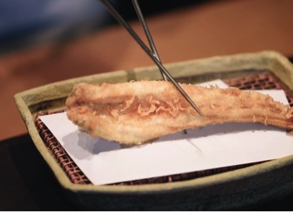 他制作的天婦羅魚仿佛前一秒還在游動,但游著游著就變成了食物,從油鍋中撈出,擺在了考究的餐碟上。這個餐碟其實是你面前的一個小竹籃,鋪著一層吸油紙,早乙女會用長長的筷子把剛剛炸好的天婦羅夾到上面,有的會從中間一分為二,有的平行著擺上兩只。金黃色的天婦羅看上去很誘人,能讓人拋卻節(jié)食的想法。