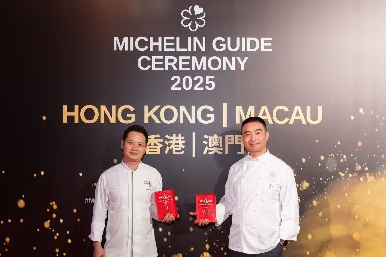圖片說明:淮揚曉宴高級主廚肖飛(右)及澳門四季酒店中餐廳行政總廚何鑫濤出席《香港澳門米其林指南2025》典禮。