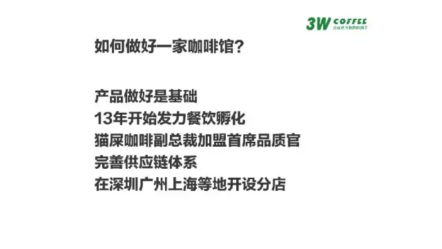 在2013年年底之前其實3W咖啡在咖啡餐飲這塊業(yè)務真的沒有下太大的功夫。外界以為3W咖啡就是個幌子。 我們后來明白就是做好餐飲。不光是說有一個好的產(chǎn)品就OK了,因為產(chǎn)品好只是一個基礎。那更多的是你要做用戶認知,同時你還要把供應鏈完善,各種分店開好。那做好一個好咖啡我們自身理解的,就說你要知道用戶的痛點在哪兒,你要讓用戶知道你到底是誰?