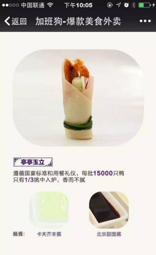 據(jù)小鴨哥運營方——北京鴨哥科技有限公司(以下簡稱“鴨哥科技”)總經(jīng)理楊艾祥介紹,為了解決烤鴨配送到消費者手中變涼的難題,他們特制了一種加熱包并取得了專利權(quán),加熱包遇水能夠釋放溫度高達90攝氏度的蒸氣。消費者用餐時,只需將加熱包放在鴨卷盒的下隔層進行反應(yīng),通過自加熱方式及蒸氣循環(huán)的原理,6分鐘的二次即時加熱,就能使其達到與堂食烤鴨65攝氏度相仿的適口溫度。此外,手工卷制鴨卷的形式,也解決了懶人用餐的用戶需求。而且,他們還突破傳統(tǒng)的面醬味型組合,提供年輕人喜歡的卡夫芥末醬,增加鴨卷的復(fù)合口感,對傳統(tǒng)烤鴨進行全面的外賣化升級。