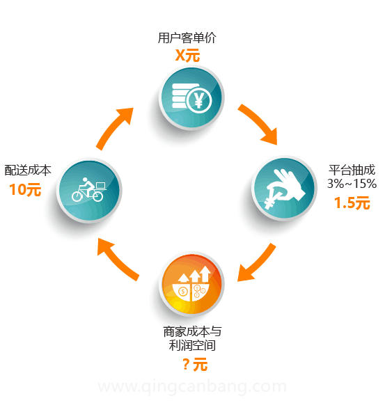 以客單價(jià)30元為例,商家成本與利潤空間=客單價(jià)30元(用戶消費(fèi))-平臺抽成1.5元(3-15%平臺引流、運(yùn)營投入)-配送10元(平均每單8-12元)= 19.5元。