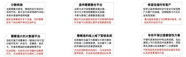 分散的終端給服務(wù)員增加了大量的工作。餐廳點(diǎn)菜時(shí)需要點(diǎn)菜寶,用微信支付寶等支付時(shí),需要的終端是手機(jī),傳統(tǒng)刷卡支付需要傳統(tǒng) POS 機(jī),服務(wù)員往往需要往返多次,耗時(shí)耗力。這種情況下,急需要一個(gè)整合的平臺(tái),可以實(shí)現(xiàn)從點(diǎn)菜到支付的一體化的連接,支付與卡券核實(shí)的連接,卡券與營銷工具的連接。整合后的平臺(tái),可以讓服務(wù)流程與平臺(tái)管理的各種行為順利過度并實(shí)現(xiàn)數(shù)據(jù)關(guān)聯(lián)。