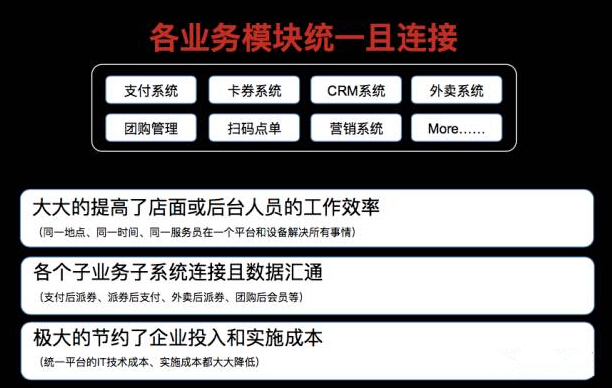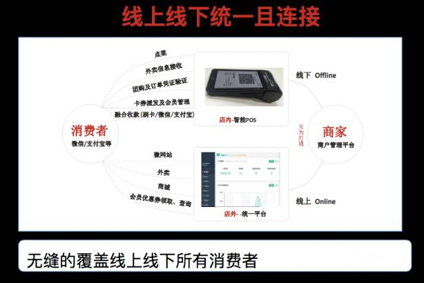 所有系統(tǒng)的商家通過統(tǒng)一平臺(tái),實(shí)現(xiàn)打通,從而無縫的覆蓋線上線下所有消費(fèi)者。比如餐廳的一個(gè)消費(fèi)行為,不管是從外賣平臺(tái)過來的,還是從團(tuán)購中過來的,抑或直接從線下過來的,只要消費(fèi),就從同一終端進(jìn)行解決,然后后臺(tái)同一系統(tǒng)進(jìn)行記錄和跟蹤消費(fèi)者數(shù)據(jù)。