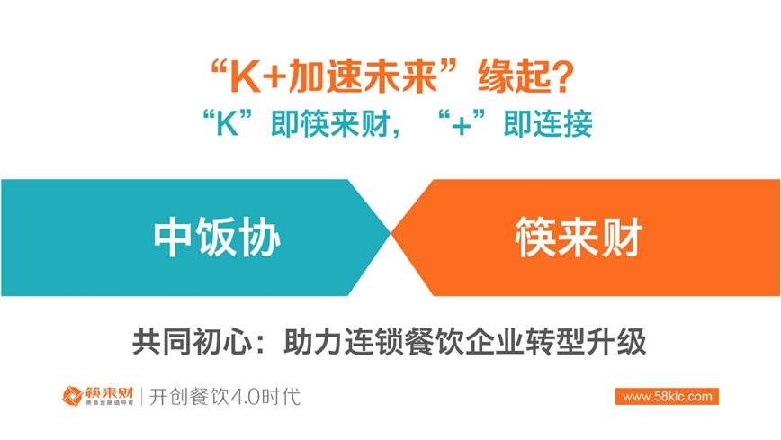 李宏文稱:“K+加速未來(lái)”計(jì)劃是應(yīng)時(shí)應(yīng)需而生。所謂“K”即筷來(lái)財(cái),“+”即連接?!癒+加速未來(lái)”計(jì)劃通過(guò)中飯協(xié)和筷來(lái)財(cái)?shù)暮献鳎B接中國(guó)餐飲市場(chǎng)上150萬(wàn)家連鎖餐飲企業(yè),連接200萬(wàn)+連鎖餐廳,連接600萬(wàn)家食材供應(yīng)商,連接1000萬(wàn)+的個(gè)人投資者,充分發(fā)揮中飯協(xié)全國(guó)性行業(yè)組織和筷來(lái)財(cái)餐飲業(yè)公共服務(wù)基礎(chǔ)設(shè)施的作用,助推餐飲企業(yè)完成升級(jí)轉(zhuǎn)型,促進(jìn)餐飲產(chǎn)業(yè)的可持續(xù)發(fā)展。