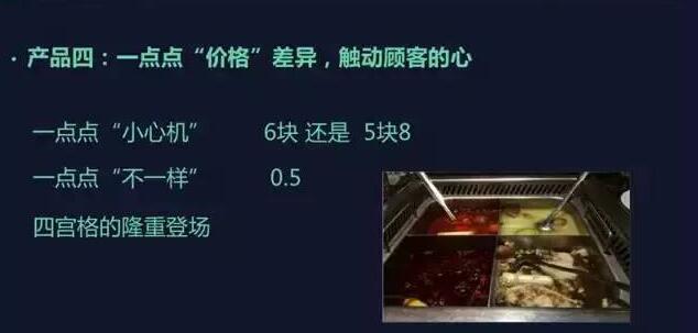 ②一點點“不一樣”在定價的角度觀察顧客需求。很多顧客在吃火鍋的時候喜歡吃不同的品種,但品種如果是一份的話分量大,吃不完,我們就推出了半份,讓客戶有更多的選擇。除了能讓顧客嘗試更多的品種,也不會造成浪費。