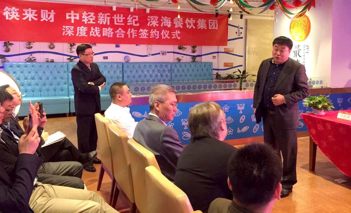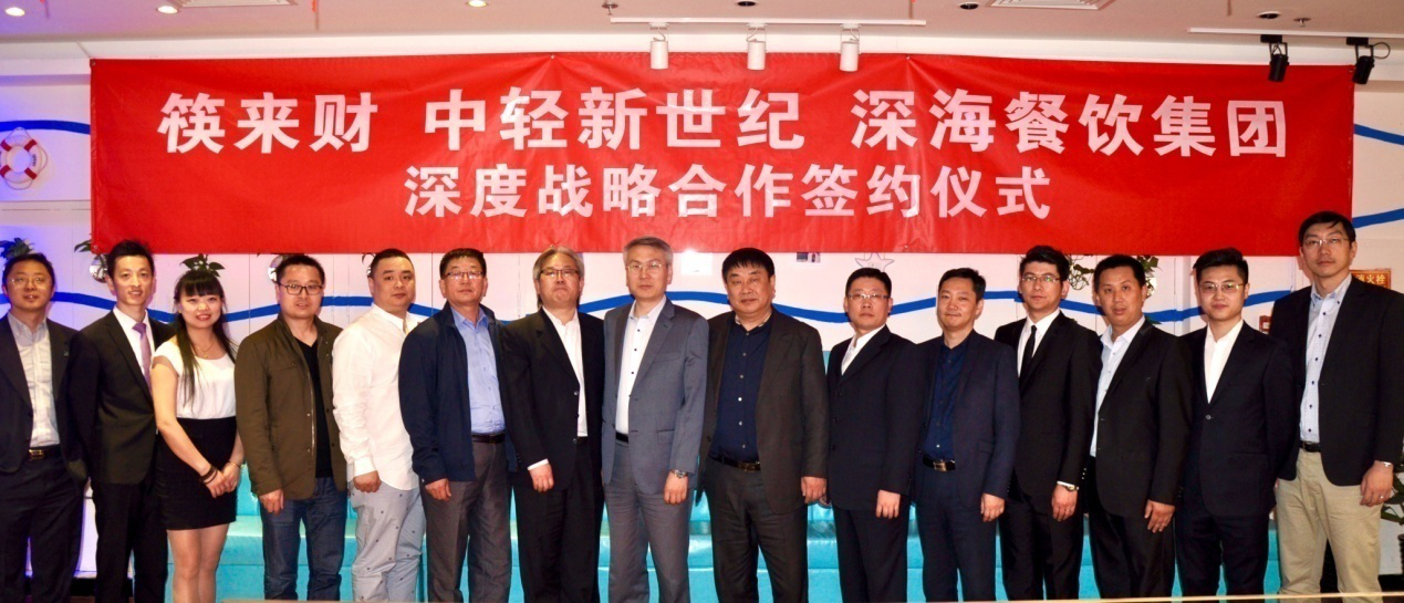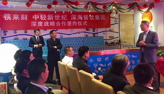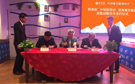 筷來財聯(lián)合創(chuàng)始人兼CEO李宏文,中輕新世紀(jì)總經(jīng)理助理崔長春以及深海餐飲集團(tuán)董事長孫志剛等三方主要領(lǐng)導(dǎo)出席當(dāng)天的簽約儀式。