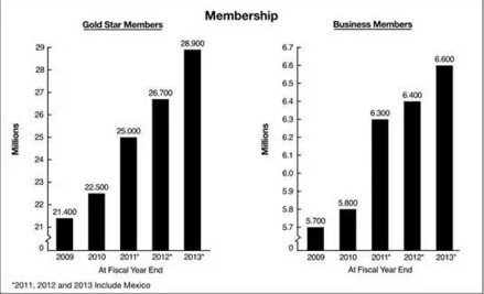 目前更以全球 41 國(guó)的 629 家賣場(chǎng)和 6,700 萬(wàn)名會(huì)員成為全球最大的連鎖會(huì)員制倉(cāng)儲(chǔ)量販集團(tuán),數(shù)以千萬(wàn)計(jì)的會(huì)員每年所繳的會(huì)費(fèi)約占 Costco 總銷售額的 2%,但是在整體利潤(rùn)中卻有高達(dá)54% 的比例。2014 年給 Costco 帶來(lái)商品銷售賺入10 億美元、會(huì)員費(fèi)收入賺進(jìn) 24 億美元的獨(dú)特且穩(wěn)定的利潤(rùn)結(jié)構(gòu)。