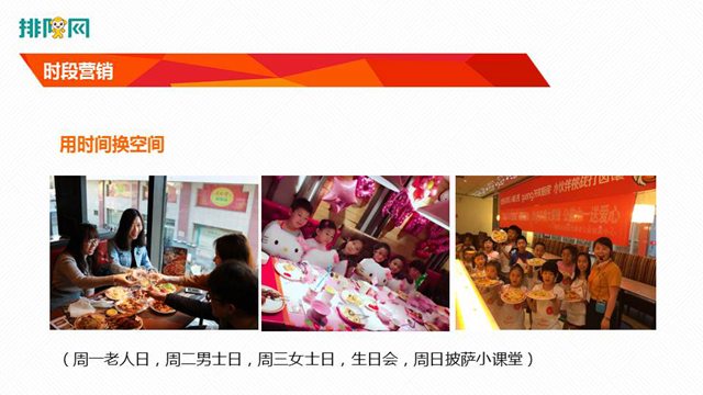 2.時段營銷。餐飲人都有體會:周末銷售都很好,而周一到周五生意就差一些。我們就想著怎么把周一到周五的生意做好。我們想到了用時段營銷。周一到周五不用排隊,我們可以吸引對價錢敏感而時間充裕的人來就餐。讓他們不在高峰期來,而在低峰期來。我們設(shè)定老人日、男士日、女士日、生日會等等,一些價格敏感型人可能就會在不同時間來,大大提升了周一到周五的客流。