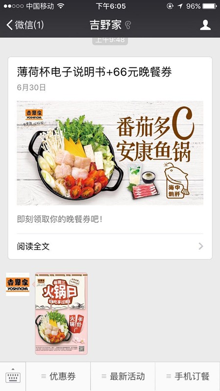 現(xiàn)在已有很多經營者懂得用微信公眾號去進行營銷,培養(yǎng)粉絲,定期推送餐品信息,活動信息等。用戶一關注公眾號即可領取優(yōu)惠券,查看最新活動,使用自助點餐功能。定期結合熱點策劃推送活動信息、餐飲信息給粉絲,粉絲可以在微信實時評論,與微信運營者保持良好互動。