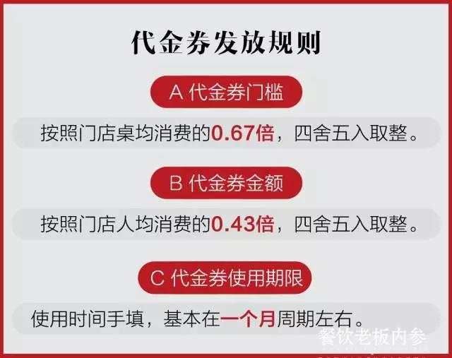 比如,一個位于寫字樓商圈的門店,工作日人流充足,它要解決的問題是周末引流問題。因此需要設(shè)置代金券的使用條件:“工作日進店消費滿200元,即可獲贈周末50元代金券”。具體的金額測算邏輯,是根據(jù)具體門店的桌均和人均計算得出的,不能照搬。