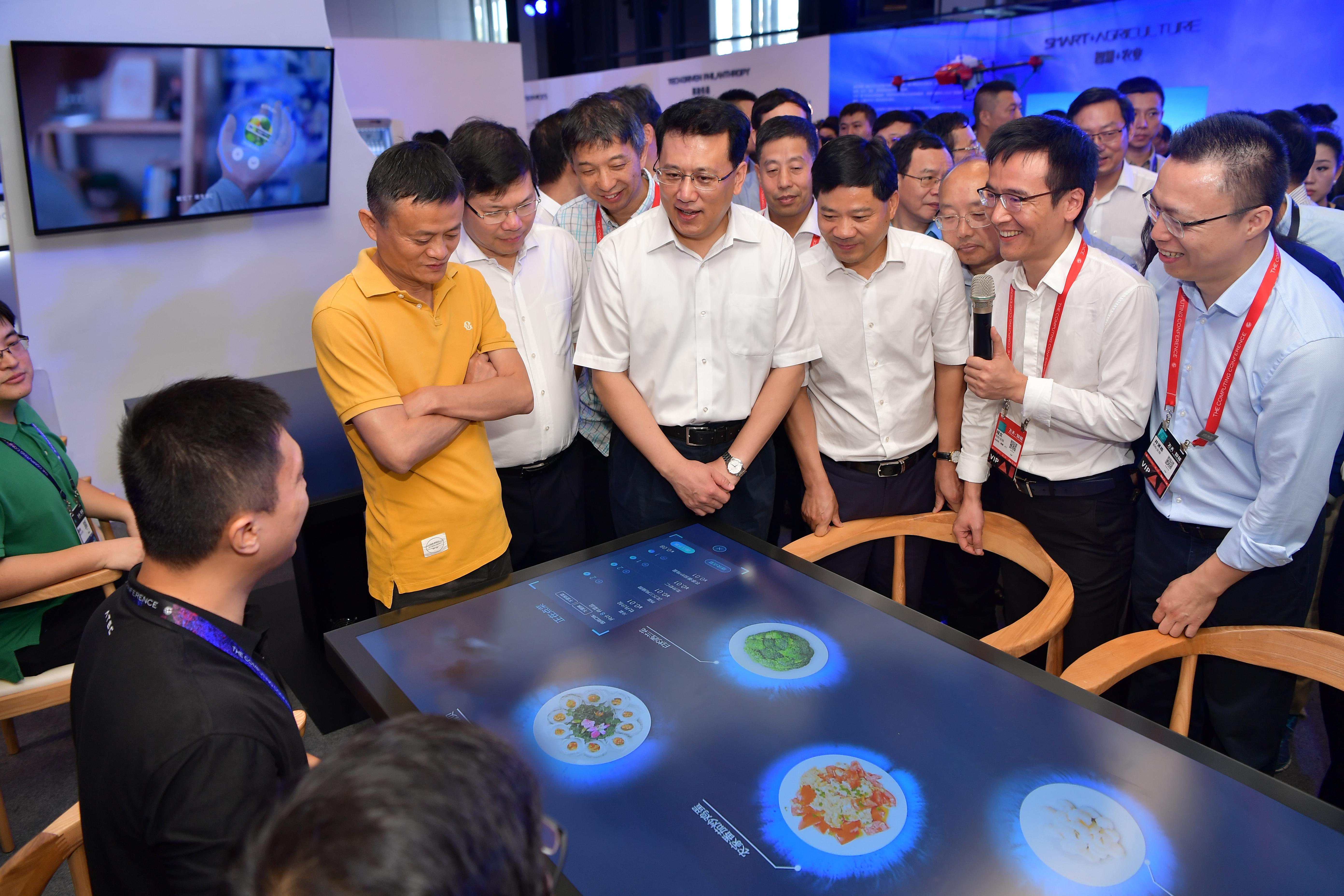 今天上午,浙江省省長袁家軍和馬云探營云棲大會,兩人在未來智能餐廳的餐桌上方用手比比劃劃“懸空點餐”。菜上來后,吃完就走,支付寶自動扣款。