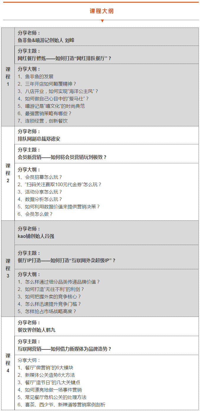 本期創(chuàng)新營將邀請四位在互聯(lián)網(wǎng)營銷上頗有心得的業(yè)內(nèi)人士參與,從網(wǎng)紅餐廳&超級IP塑造、會員營銷、新媒體營銷、危機公關(guān)等角度,全面覆蓋互聯(lián)網(wǎng)營銷關(guān)鍵點。