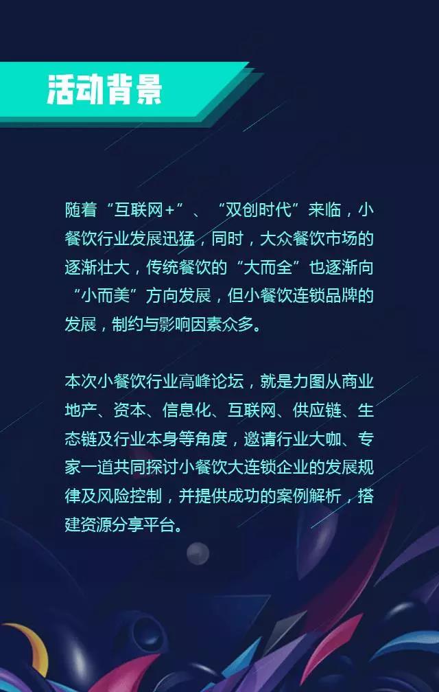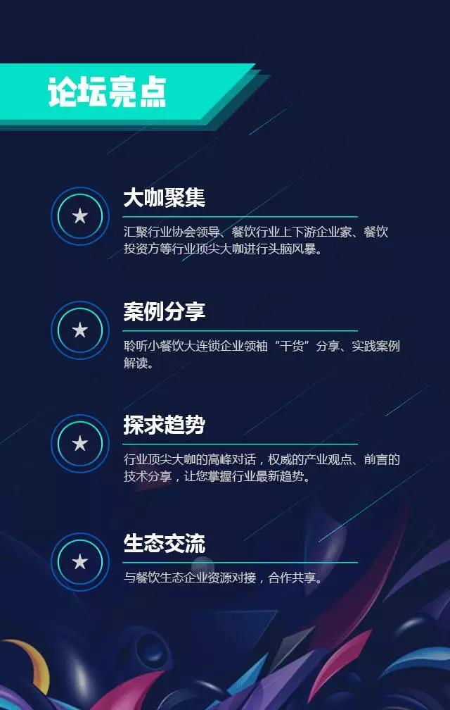 通過(guò)精彩演講、尖峰對(duì)話等多模式實(shí)現(xiàn)信息共享,更多看點(diǎn)、更加精彩,創(chuàng)造最具豐富性和影響力的中國(guó)小而美餐飲行業(yè)峰會(huì)。