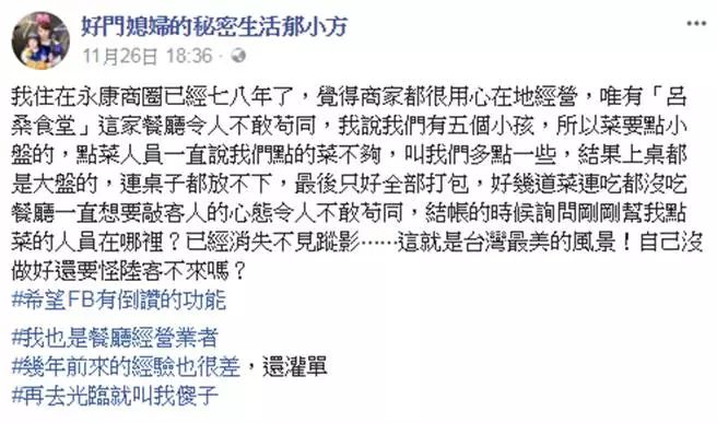 近日,臺灣的某家餐廳就因為這樣被投訴。身家上億的貴婦藝人郁方最近在社交平臺上投訴她附近的餐廳宰客。