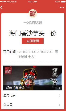 在廣告創(chuàng)意上,一鍋到底以文案“煮一鍋紅艷,品百味人生”配合圖片四川經(jīng)典的變臉形象烹制火鍋,重慶火鍋紅油翻滾的場(chǎng)景躍然眼前,讓吃貨們浮想聯(lián)翩。用戶(hù)點(diǎn)擊“領(lǐng)取優(yōu)惠”,可直接跳轉(zhuǎn)到卡券領(lǐng)取頁(yè)面,免費(fèi)獲得一份海門(mén)香沙芋頭的福利,憑核銷(xiāo)碼到店消費(fèi)。卡券頁(yè)面嵌入規(guī)則介紹和適用門(mén)店,促進(jìn)用戶(hù)到店。