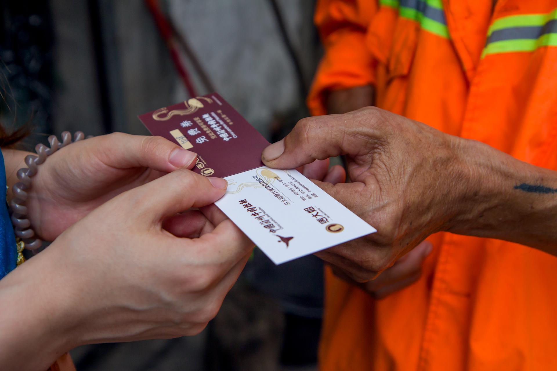 (高原姑娘將免費(fèi)的牛肉面券送到長(zhǎng)沙環(huán)衛(wèi)工人手中)