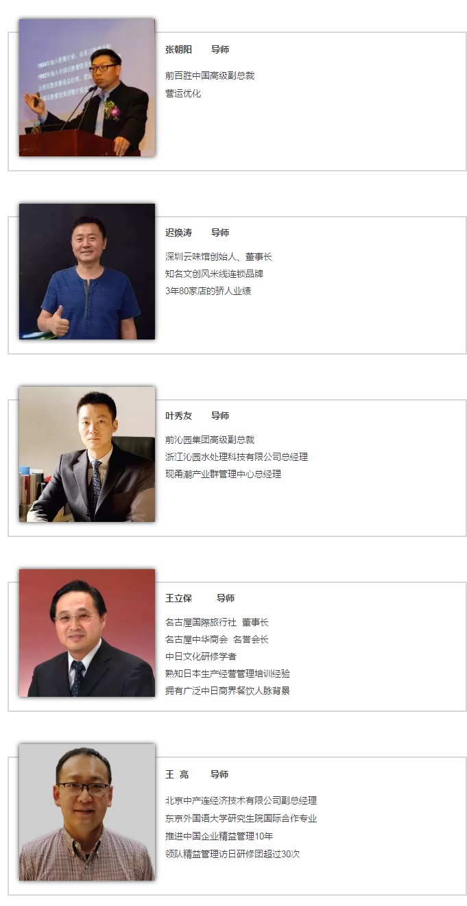 【日本中產(chǎn)連】全稱【中部產(chǎn)業(yè)連盟】日本國經(jīng)濟產(chǎn)業(yè)省直屬的官方效率技術(shù)專業(yè)機構(gòu),是日本歷史最久規(guī)模最大的工業(yè)生產(chǎn)管理技術(shù)研究、指導(dǎo)和普及的專業(yè)集團之一。擁有廣泛產(chǎn)業(yè)資源,是日本最大的產(chǎn)業(yè)聯(lián)盟?!度毡窘?jīng)營管理標(biāo)準(zhǔn)(JMS)》的制定者,因此本項目具有深厚的日本產(chǎn)業(yè)界背景,除中高層管理人員外,有機會邀請到多位行業(yè)巨擘、知名餐飲或供應(yīng)鏈企業(yè)的董事長現(xiàn)場論道交流,更有機會走到企業(yè)的生產(chǎn)車間、中央廚房、門店后廚等實地考察學(xué)習(xí)。