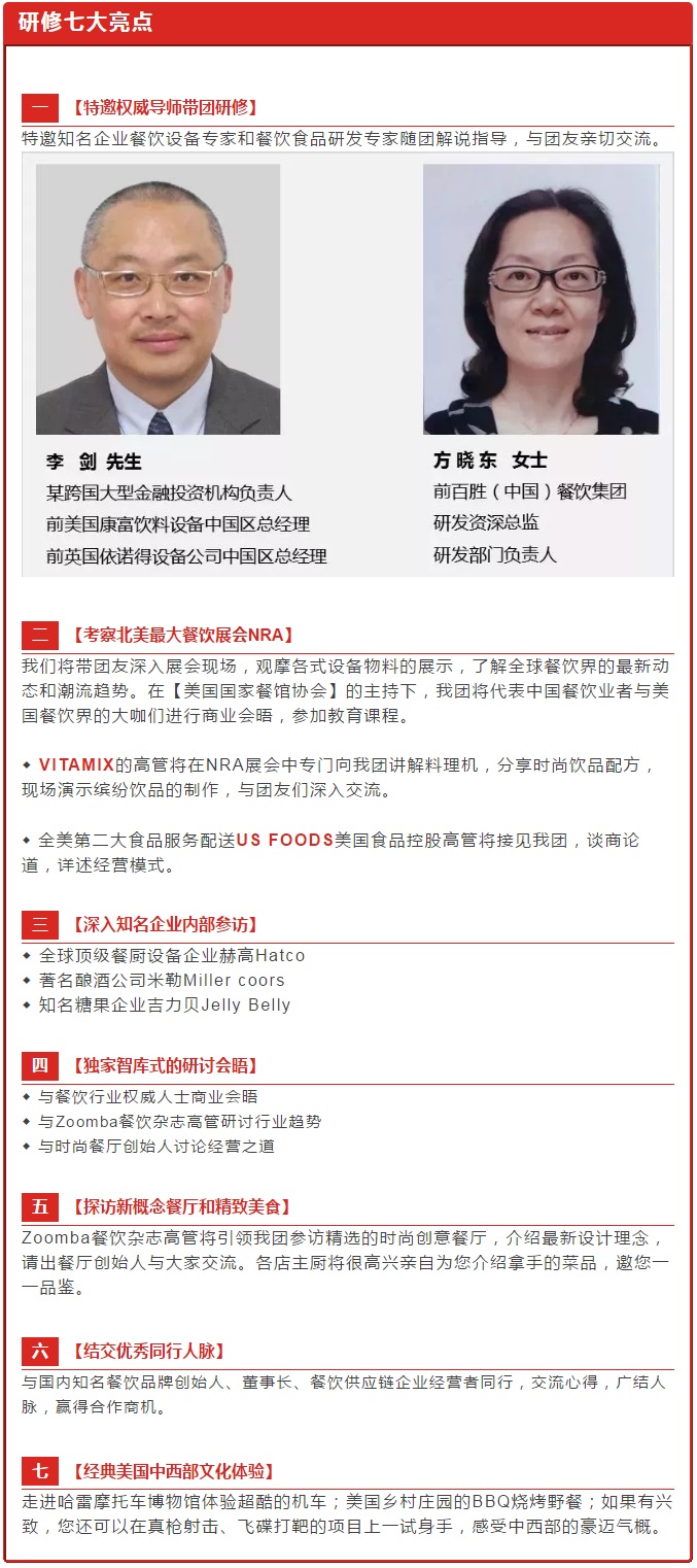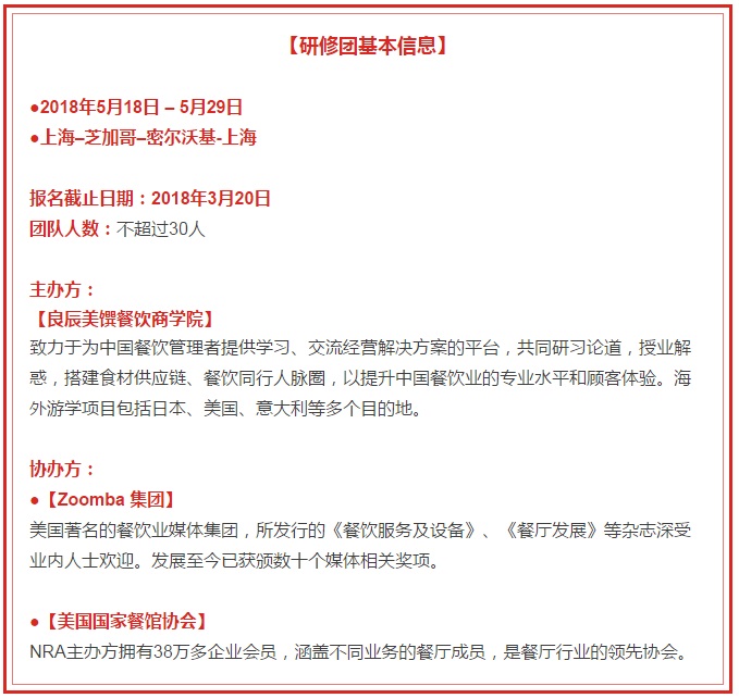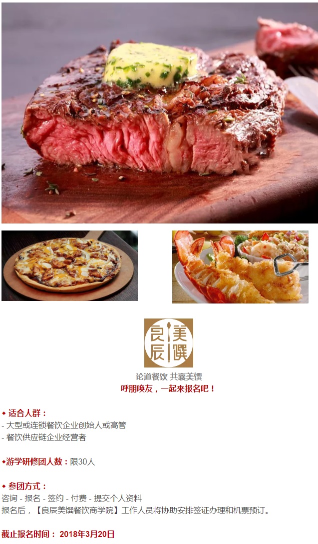 【良辰美饌餐飲商學院】重磅推出“中國餐飲精益管理美國精英研修團”,將以上精彩一網(wǎng)打盡。現(xiàn)向餐飲業(yè)精英發(fā)出召集令------讓我們一同啟程探尋美國餐飲文化之風采:展會調(diào)研、企業(yè)參訪、大咖交流、餐廳巡禮、跨界體驗、美食品鑒......
