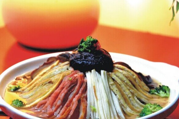 6. 然后將湯汁倒入盤中。讓調(diào)好味的湯汁浸泡著三絲.就可以開吃了~