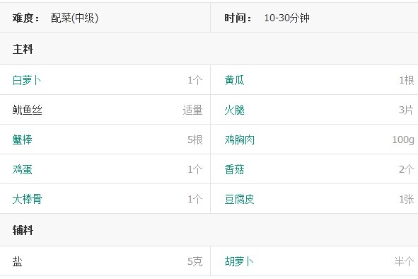 白蘿卜、魷魚、黃瓜、胡蘿卜、火腿、雞胸、蟹棒、香菇、雞蛋,大棒骨
