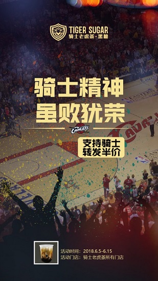 為了給騎士隊加油,騎士老虎茶相繼推出了兩大活動,第二杯半價與贏一場全部門店推出免費茶!其中,“免費茶”活動受到了廣大球迷與消費者的廣泛關(guān)注。特別是對于球迷們來說,“免費茶”的意義早已不是“免費”本身,而是其背后代表的勝利與驕傲。然而,現(xiàn)實讓人嘆息,騎士隊被勇士四連勝橫掃,勇士隊登鼎NBA本賽季冠軍的背景就是騎士隊的落寞與詹姆斯的無奈。