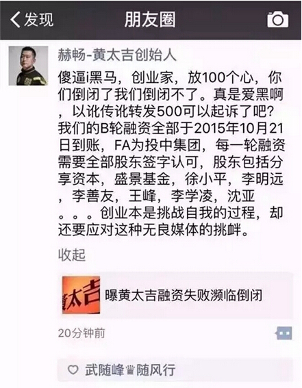 黃太吉前兩天被倆“傻逼”(赫暢語(yǔ))黑了——《i黑馬》與《創(chuàng)業(yè)家》稱(chēng),據(jù)某投資人爆料,轉(zhuǎn)型做O2O外賣(mài)的黃太吉B輪融資沒(méi)到位,瀕臨倒閉。
