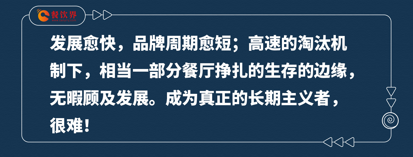 發(fā)展愈快,品牌周期愈短;高速的淘汰機制下,相當(dāng)一部分餐廳掙扎的生存的邊緣,無暇顧及發(fā)展。成為真正的長期主義者,很難!