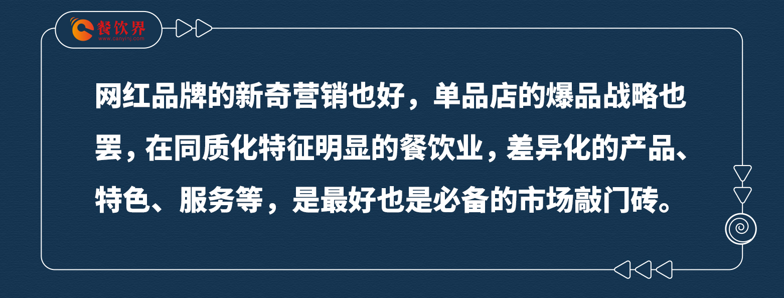網(wǎng)紅品牌的新奇營銷也好,單品店的爆品戰(zhàn)略也罷,在同質(zhì)化特征明顯的餐飲業(yè),差異化的產(chǎn)品、特色、服務(wù)等,是最好也是必備的市場敲門磚。