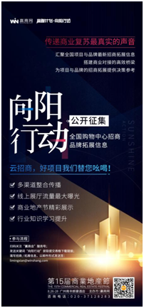 為了重振行業(yè)信心,幫助項(xiàng)目與品牌雙方掌握一手信息,搭建購(gòu)物中心與品牌之間的信息溝通橋梁,由第15屆商業(yè)地產(chǎn)節(jié)與贏商網(wǎng)推出的「贏春計(jì)劃」特別設(shè)置“向陽(yáng)行動(dòng)“欄目,收集品牌拓展、項(xiàng)目開(kāi)業(yè)最新計(jì)劃的一手信息,為項(xiàng)目與品牌的招商拓展提供決策參考。