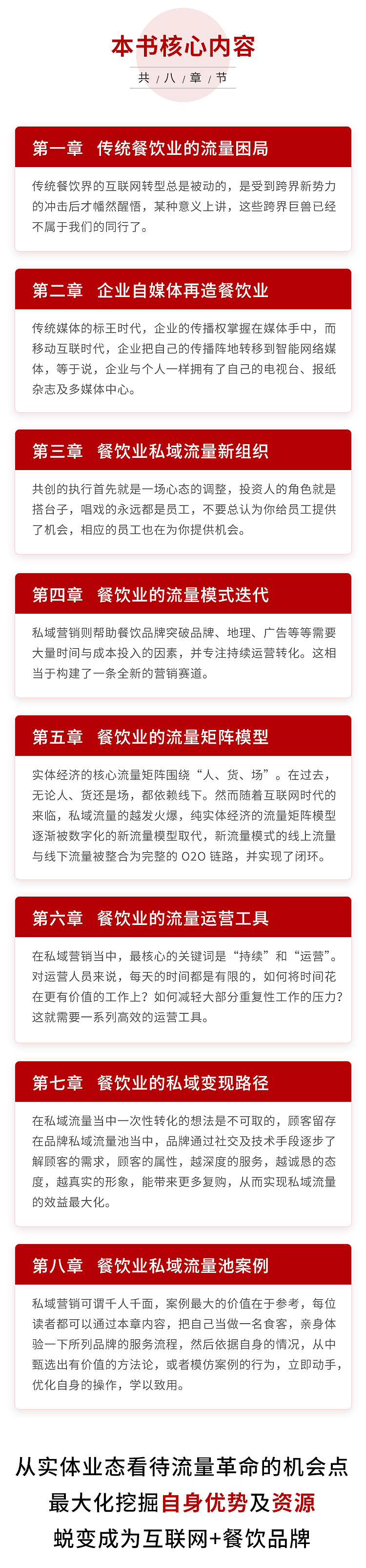主要圍繞餐飲業(yè)面對(duì)流量貴、流量少、流量假的困局,如何破局,這個(gè)角度出發(fā),看懂流量困局折射出餐飲人對(duì)互聯(lián)網(wǎng)認(rèn)知斷層的這樣一種現(xiàn)實(shí)存在,所以,編寫了行業(yè)第一本系統(tǒng)描述餐飲業(yè)如何搭建私域流量的工具書,但不僅是工具。
