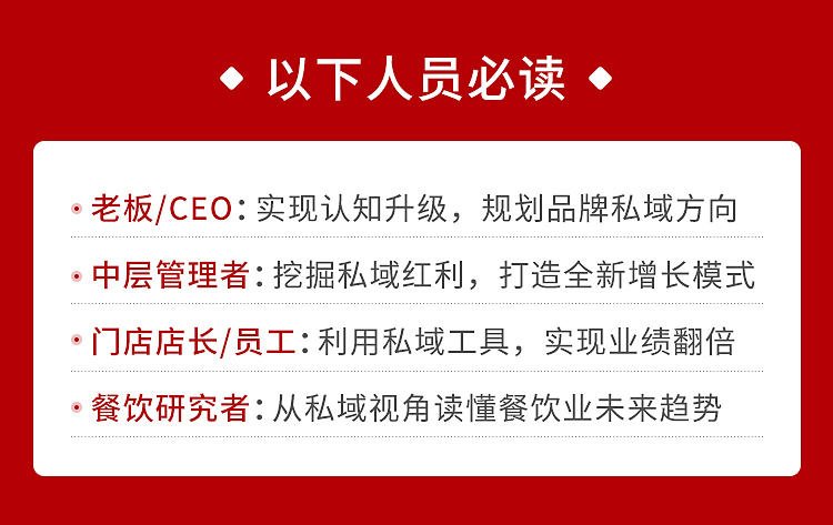 所以,本書最大的特點(diǎn)是站在餐飲的角度+互聯(lián)網(wǎng),從實(shí)體這個(gè)業(yè)態(tài)看待流量革命的變遷及機(jī)會(huì)點(diǎn),最大化的挖掘自身優(yōu)勢(shì)及資源,蛻變成為互聯(lián)網(wǎng)+餐飲、實(shí)現(xiàn)從公域到私域、從存量到流量、從流量裂變,從裂變到變現(xiàn)的閉環(huán)商業(yè)。