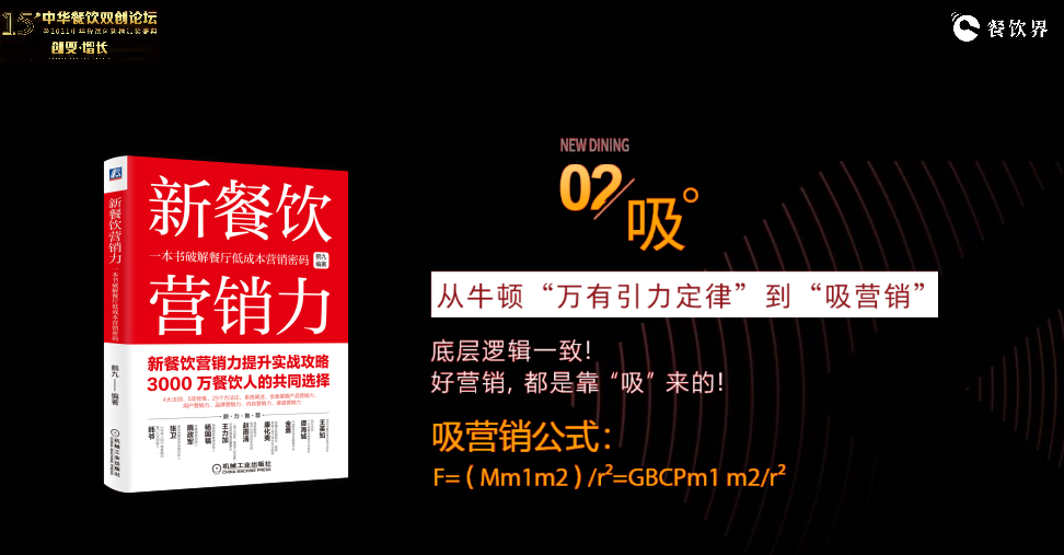 我在我的新書《新餐飲營銷力》里首次提出了“吸營銷”理論。這里邊的“吸”,跟牛頓萬有引力定律里描述的”任何物體之間都有互相吸引力”原理幾乎相通。我們設想一下:牛頓萬有引力公司是F=GM1M2/r2,這里的M1M2分別是兩個物體的質量,r是兩個物體之間的距離,質量越大、距離越短,兩個物體之間的吸引力就越強。而在商業(yè)環(huán)境中,M1代表營銷主題的“產品力”,M2應當是目標用戶對產品的“需求力”,r應當是營銷信息與目標用戶之間的傳播路徑。