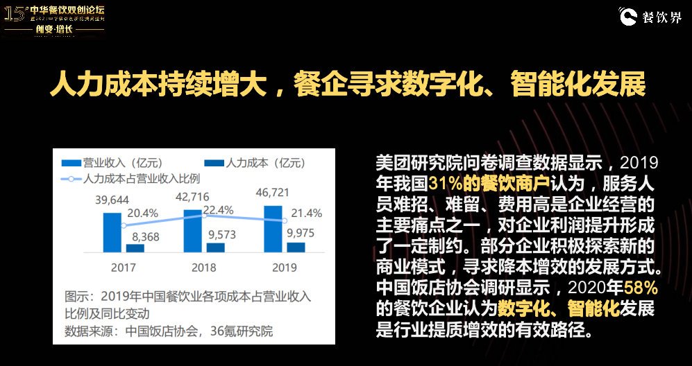 我們在開篇的一組驚人數據中,我們已經得知,中國餐飲行業(yè)4大成本結構每年都在遞增。對此,美團研究院問卷調查數據顯示,我國31%的餐飲商戶認為,服務人員難招、難留、費用高是企業(yè)經營的主要痛點之一。而中國飯店協會調研顯示,2020年58%的餐飲企業(yè)認為數字化、智能化發(fā)展是行業(yè)增效的有效路徑。
