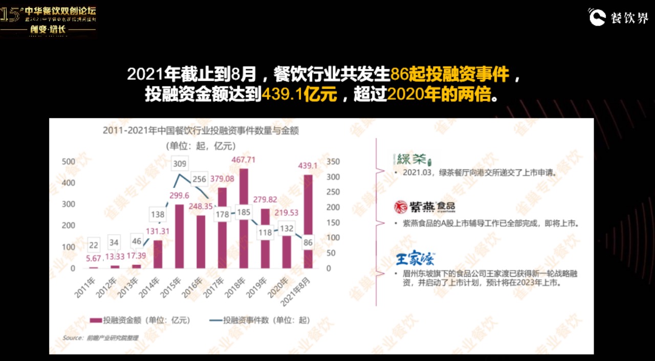 在大消費賽道備受資本青睞的大背景下,餐飲也成為了“香餑餑”。據前瞻數據統計,2021年截止到8月,餐飲行業(yè)共發(fā)生86起投融資事件,投融資金額達到439.1億元,超過2020年的兩倍。