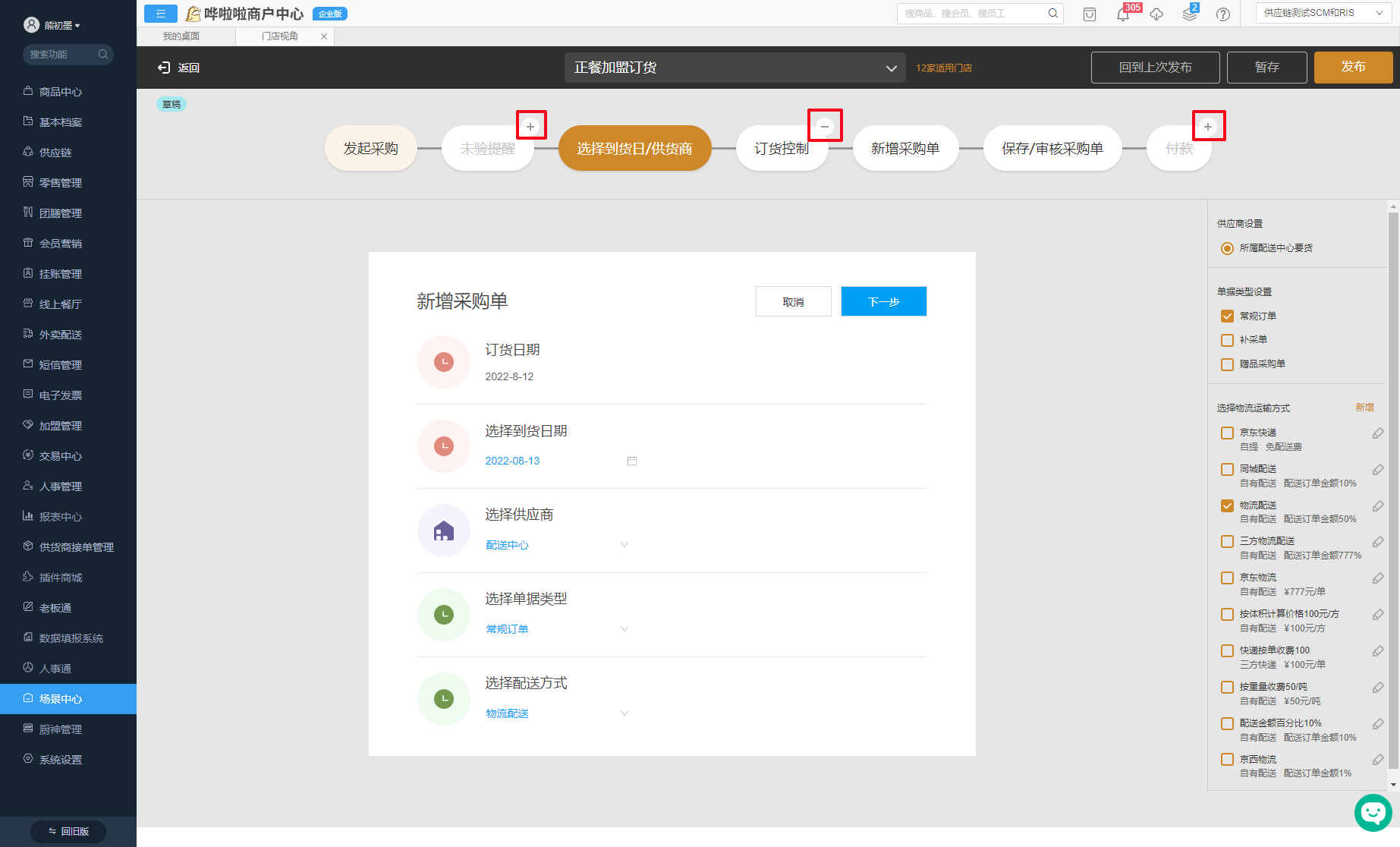 如針對(duì)訂貨業(yè)務(wù)流程,總部可根據(jù)自身業(yè)務(wù)情況,通過(guò)點(diǎn)擊“+”“-”添加、刪減業(yè)務(wù)流程節(jié)點(diǎn),自定義配置業(yè)務(wù)流程,滿足企業(yè)不同場(chǎng)景下的不同業(yè)務(wù)操作流程需求。