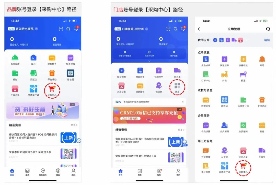 登錄【掌上客如云】APP、【首頁】— 【更多】—【第三方服務(wù)】—【采購中心】