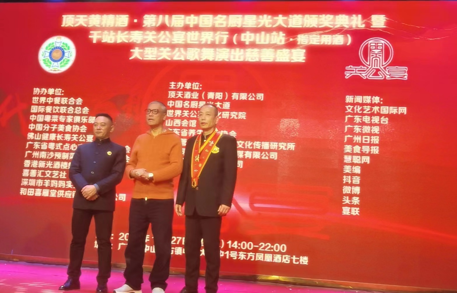 來(lái)自五湖四海的關(guān)公文化友人,志同道合的同行,倘若你發(fā)問(wèn):今天(2023年12月27日)為什么選擇蒞臨頂天黃精酒·第八屆中國(guó)名廚星光大道頒獎(jiǎng)典禮暨千站長(zhǎng)壽關(guān)公宴世界行(中山站)大型關(guān)公歌舞演出慈善盛宴,那么我可以坦誠(chéng)的告訴你,因?yàn)槌嘧又牡哪?,因?yàn)槿河⑺C萃,三人行必有我?guī)煛_@里是餐飲人點(diǎn)燃激情展現(xiàn)才華的“紫禁之巔”……是餐飲之“道”讓我們聚在一起,締造華夏旖旎的靚麗風(fēng)景線,去年"第七屆中國(guó)名廚頒獎(jiǎng)典禮暨首屆千站長(zhǎng)壽關(guān)公宴世界行(廣州站)"在廣東迎賓館已成功舉辦,今天(2023幸12月27日)頂天黃精酒·第八屆中國(guó)名廚星光大道頒獎(jiǎng)典禮暨千站長(zhǎng)壽關(guān)公宴世界行(中山站)大型關(guān)公歌舞演出慈善盛宴,在中山古鎮(zhèn)東方鳳凰酒店隆重舉行。國(guó)際餐飲聯(lián)合總會(huì)會(huì)長(zhǎng)胡珠、頂天酒業(yè)(青陽(yáng))有限公司董事長(zhǎng)王浩然、世界警察博擊大賽冠軍邢金喜、世界龍岡劉關(guān)張趙管委會(huì)主席張景耀、中山古鎮(zhèn)鎮(zhèn)黨委副書(shū)記吳國(guó)森、廣東同撈同煲文化傳媒有限公司董事長(zhǎng)陳浩全、世界關(guān)公文化品牌協(xié)會(huì)會(huì)長(zhǎng)成耀軍、山西會(huì)館董事長(zhǎng)高紹軍、廣州市南沙區(qū)預(yù)制菜進(jìn)出口貿(mào)易協(xié)會(huì)會(huì)長(zhǎng)肖盛龍、國(guó)際關(guān)公文化協(xié)會(huì)主席馬小平、香港山西商會(huì)會(huì)長(zhǎng)吳騰、香港警察隊(duì)員佐級(jí)協(xié)會(huì)總部總區(qū)副主席關(guān)其海、山東滕州市稅務(wù)局局長(zhǎng)關(guān)祥勇、山西省人民政府駐廣州辦事處黨組書(shū)記主任王世超、珠海市餐飲協(xié)會(huì)原會(huì)長(zhǎng)常勝、珠海市餐飲協(xié)會(huì)會(huì)長(zhǎng)邵力、中國(guó)美食協(xié)會(huì)廣州分會(huì)會(huì)長(zhǎng)陳土全、鶴山市餐飲行業(yè)協(xié)會(huì)會(huì)長(zhǎng)胡潤(rùn)勤、中國(guó)大導(dǎo)演王星軍、南方衛(wèi)視《我愛(ài)返尋味》主持人舅父新、開(kāi)平關(guān)族圖書(shū)館管委會(huì)主任關(guān)在練、佛山關(guān)公文化協(xié)會(huì)執(zhí)行會(huì)長(zhǎng)高春旭、香港四大美食家四哥、深圳羊媽媽實(shí)業(yè)有限公司董事長(zhǎng)何玉清、珠海市廚師協(xié)會(huì)理事長(zhǎng)林毓海、順德名廚會(huì)秘書(shū)長(zhǎng)奔州強(qiáng)等嘉賓出席本次活動(dòng)。