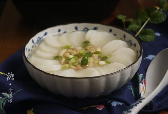 3. 煮鍋里放入高湯和清水,再放入蘿卜片和蝦米。