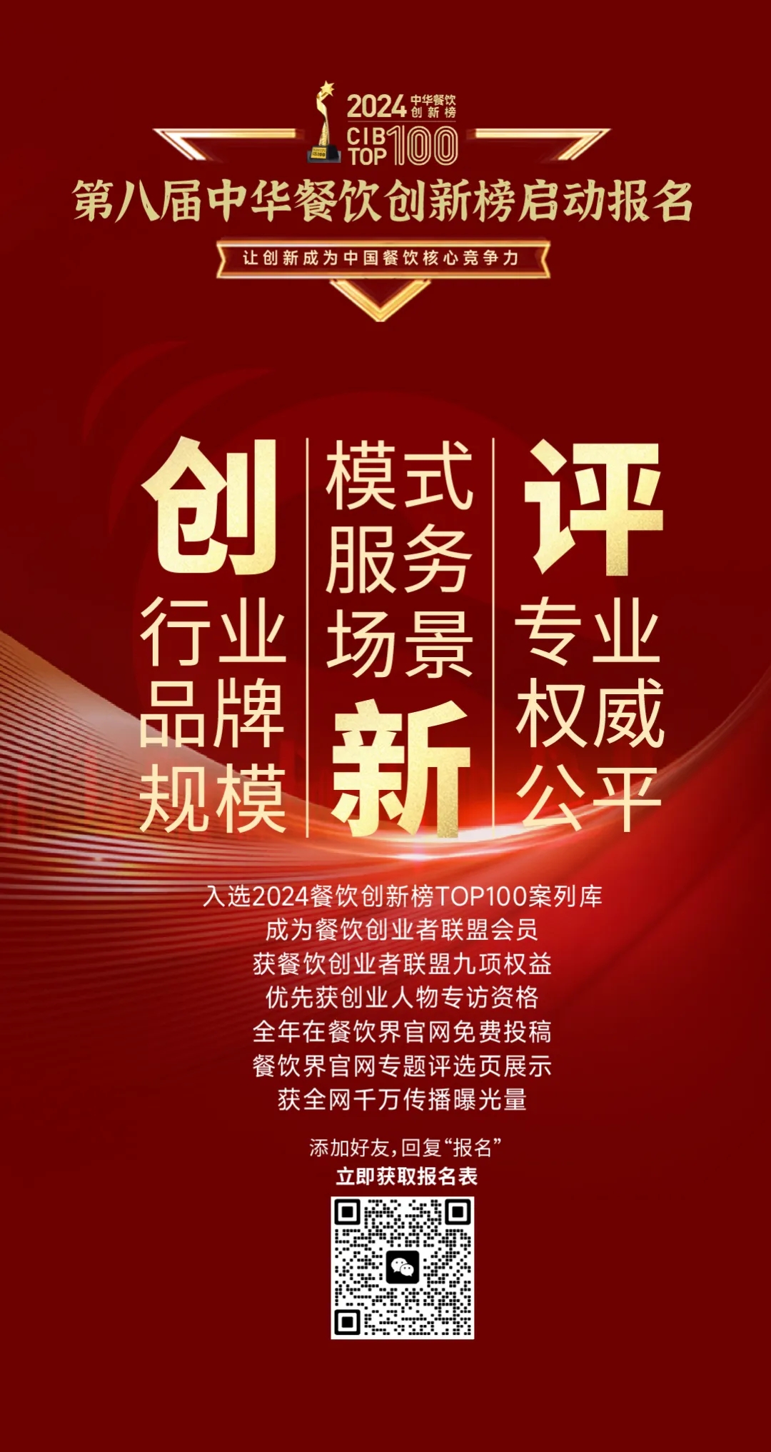 活動(dòng)將持續(xù)6個(gè)月報(bào)名海選,預(yù)計(jì)2024年9月開啟線上公開投票,一個(gè)月的線上投票活動(dòng)后進(jìn)入專家評(píng)審團(tuán)復(fù)審,整個(gè)活動(dòng)在歷時(shí)的海選、網(wǎng)選與專家評(píng)審后,將于2024年12月份全網(wǎng)公布。目前,評(píng)選活動(dòng)已火爆開啟,感興趣的餐飲企業(yè)可以掃描下方二維碼報(bào)名、或點(diǎn)擊下方閱讀原文參與報(bào)名