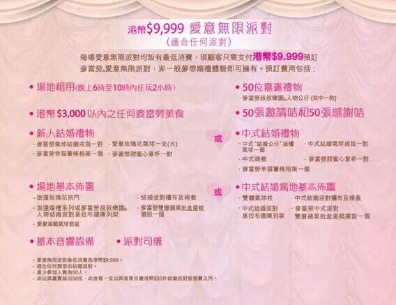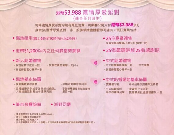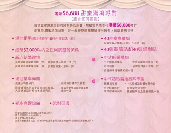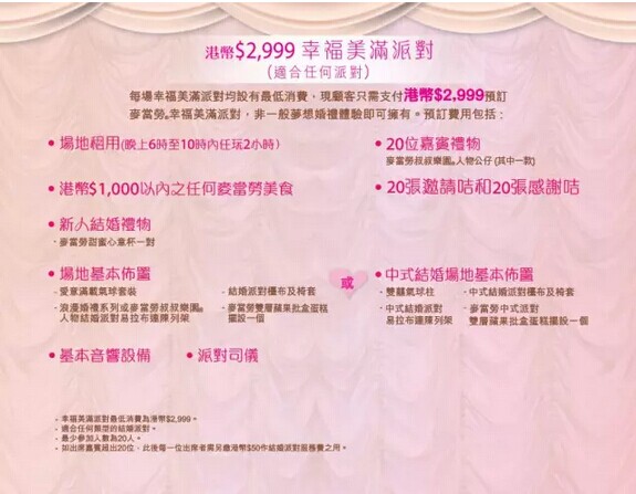 另外麥當勞官網(wǎng)還提及,不止是結婚,其他例如訂婚、慶祝結婚周年紀念或婚前慶祝派對,都可以在老麥搞一搞。