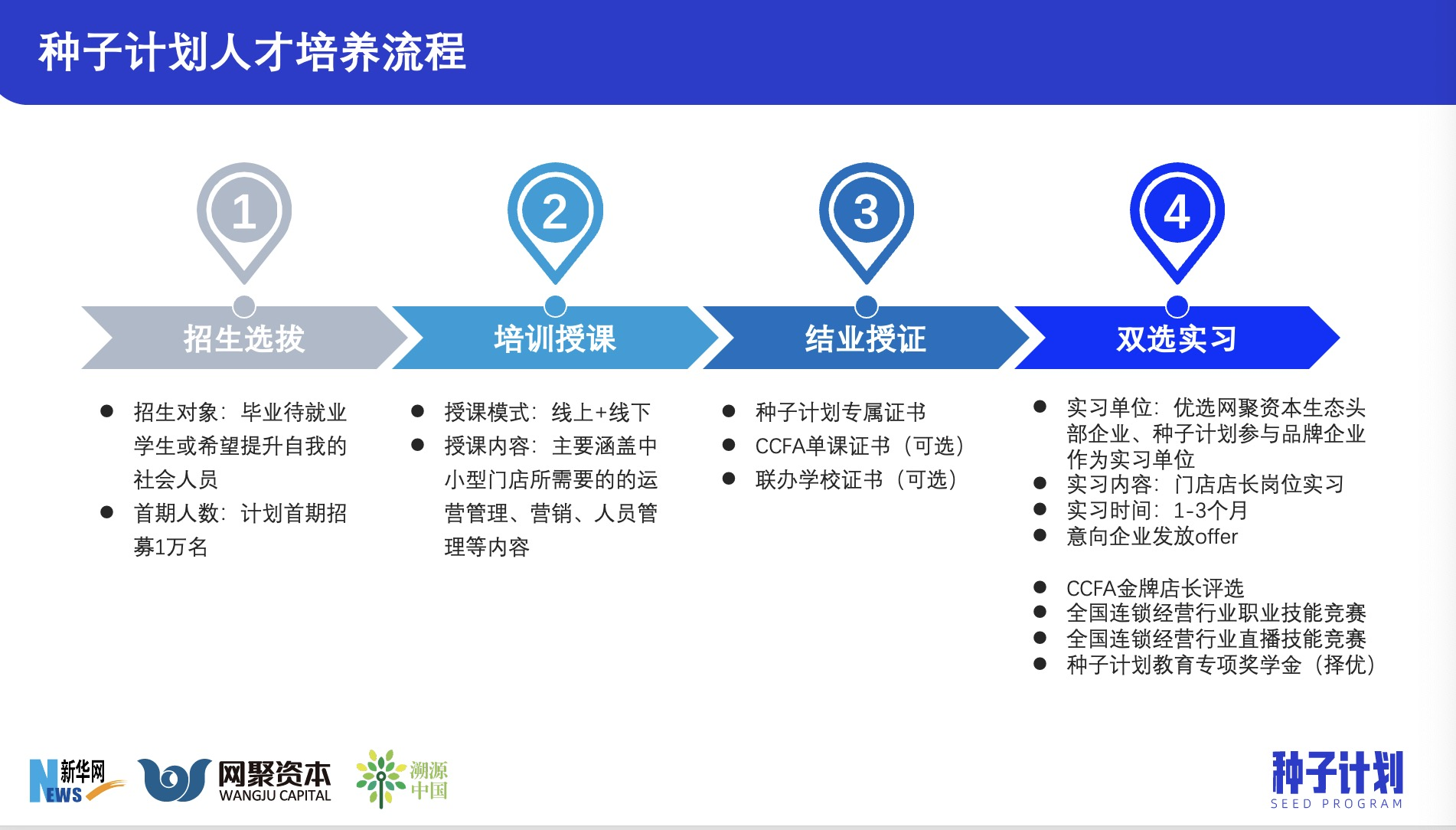 網(wǎng)聚資本總經(jīng)理王震國對種子計劃·百萬店長人才培養(yǎng)計劃進行了推介,種子計劃·百萬店長人才培養(yǎng)計劃基于新的市場環(huán)境和連鎖行業(yè)發(fā)展需求,經(jīng)過產(chǎn)學研各方專家共同迭代,汲取數(shù)十家頭部連鎖品牌企業(yè)的培養(yǎng)實踐,對店長能力模型進行了重構——提出了認知能力、專業(yè)能力、管理能力、組織能力、經(jīng)營能力相結合的卓越店長“五力模型”,設計了循序漸進式的“三階段”連鎖店長課程體系,涵蓋線上學前課程、線下核心課程、可選進階課程,由多位行業(yè)專家作培訓指導,主要面向大學生、退伍軍人、社會就業(yè)人員與現(xiàn)任門店店長招生,計劃攜手連鎖行業(yè)協(xié)會,連鎖頭部品牌企業(yè),大專院校、人才招聘企業(yè)等多方伙伴,共同努力,向連鎖行業(yè)輸送百萬名合格店長,為幫扶產(chǎn)業(yè)、促進消費、提升就業(yè)貢獻力量。